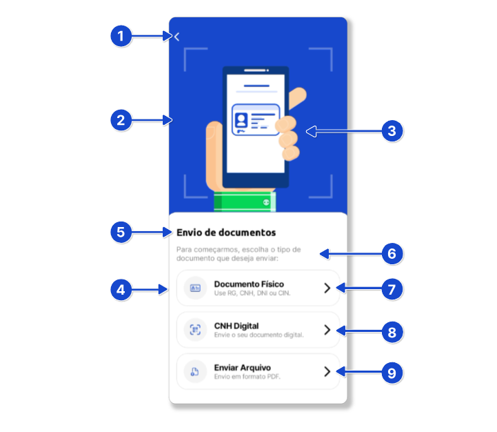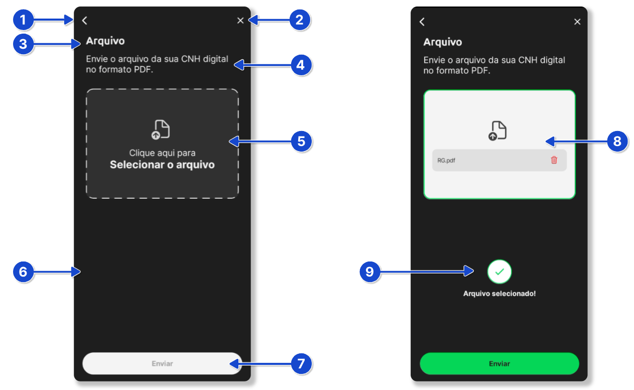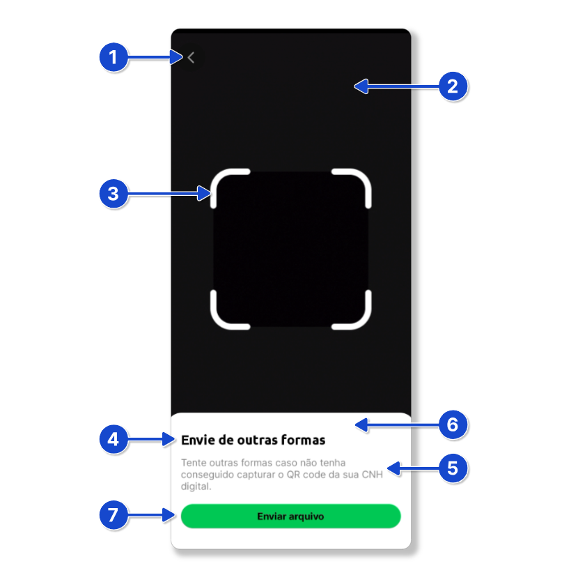 - Se o usuário não ler o QR e clicar no botão para enviar o arquivo: QR → Upload (CNH Digital) → Loading → Resultado.